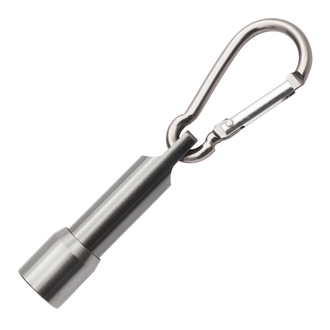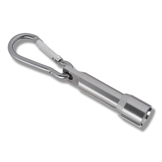 Brelok latarka LED z karabińczykiem. Zasilana 4 bateriami AG3 (dołączone do produktu). Pakowana w czarne opakowanie upominkowe.
