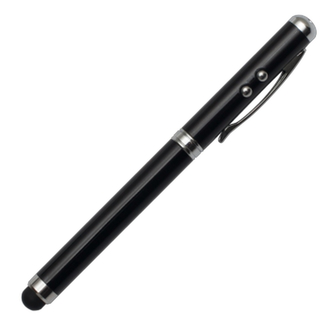 Długopis ze wskaźnikiem laserowym, latarką LED oraz końcówką przystosowaną do obsługiwania ekranów dotykowych. Dołączone baterie 3 x LR41. Pakowany w srebrne aluminiowe opakowanie upominkowe.