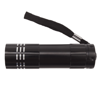 9 diodowa latarka LED wykonana z aluminium. Zasilana 3 bateriami AAA (dołączone).