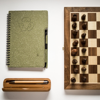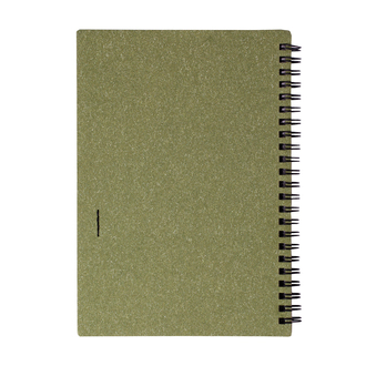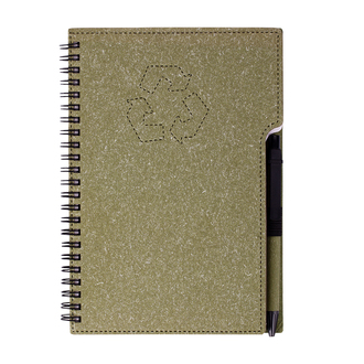 Eko notes w twardej oprawie z dołączonym długopisem w rozmiarze biurkowym (zbliżony do A5 lub większy). 70 kartek w linie (z perforacją), gramatura 70 g/m². Zarówno oprawa jak i papier wykonane zostały z surowców wtórnych. Nadają się one także do kolejnego przetworzenia. Korpus długopisu wykonany z tektury, klip, końcówka i przycisk wykonane z plastiku nadającego się do recyclingu, wkład w kolorze niebieskim. Notes posiada uchwyt na długopis.