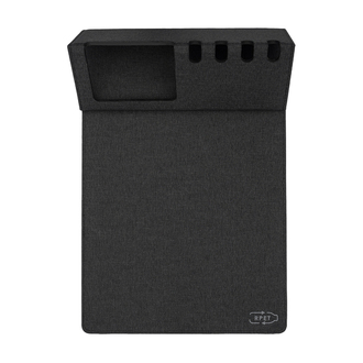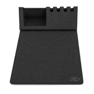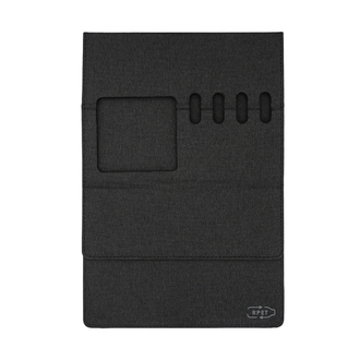 Składana podkładka pod myszkę wykonana z RPET. Posiada stojak na telefon komórkowy oraz uchwyty na cztery długopisy.