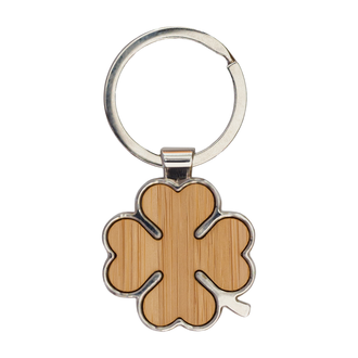 Brelok w kształcie czterolistnej koniczynki wykonany z drewna i metalu. Popularny symbol szczęścia. Pakowany w czarne opakowanie upominkowe.