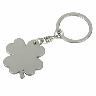 Metalowy brelok w kształcie czterolistnej koniczynki. Popularny symbol szczęścia. Pakowany w czarne opakowanie upominkowe.