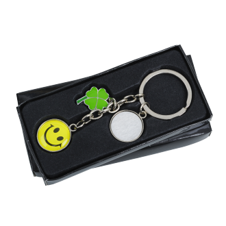 Metalowy modny brelok z zawieszkami - symbolami szczęścia: czterolistna koniczynka, buźka Happy. Pakowany w czarne opakowanie upominkowe.