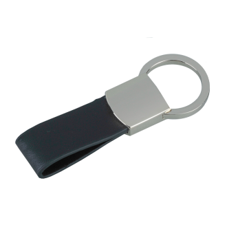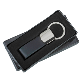 Brelok wykonany z połączenia błyszczącego metalu z ekoskórą. Pakowany w czarne opakowanie upominkowe