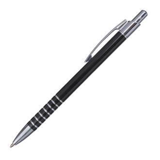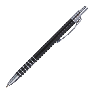 Aluminiowy długopis z metalową skuwką. Wyposażony w niebieski wkład.