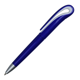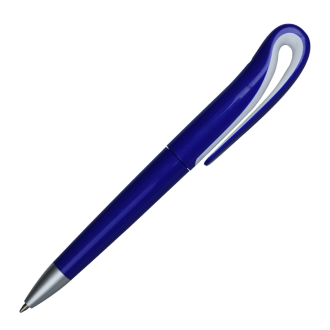 Plastikowy długopis o oryginalnym kształcie klipa. Wyposażony w niebieski wkład.