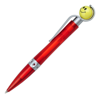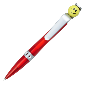 Długopis plastikowy z obrotową końcówką Happy. Wyposażony w niebieski wkład.