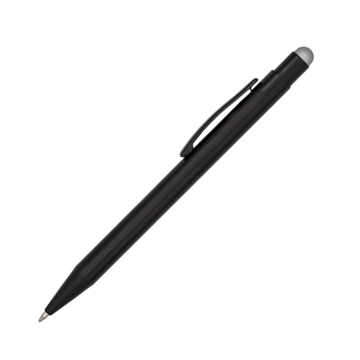 Długopis z czarnym korpusem i kolorową końcówką do ekranów dotykowych. Możliwość wykonana błyszczącego logo w kolorze nawiązującym do koloru końcówki. Niebieski wkład.