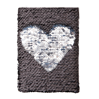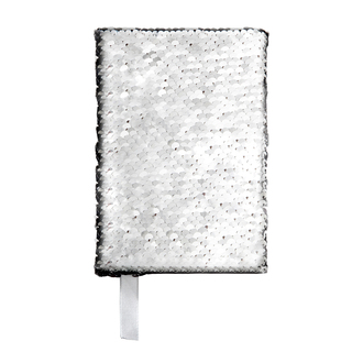 Modny błyszczący notes w oprawie z dwustronnych (czarno-srebrnych) cekinów. Przesuwając palcami po cekinach w kreatywny i przyjemny sposób możesz zmienić wygląd jego okładki. Rozmiar B6. 80 kartek w linię o gramaturze 70 g/m2. Srebrna tasiemka o szerokości 15 mm umożliwia umieszczenie na niej logo klienta. Rozmiar biurkowy.