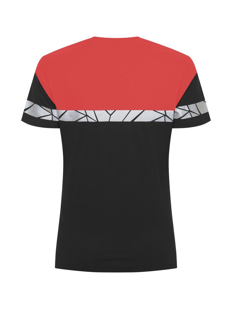 T-shirt damski o nowoczesnym kroju. Elastan oraz czterowarstwowy ściągacz przy dekolcie dla lepszego zachowania kształtu i stabilności. Kieszonka na chip do prania w wewnętrznym lewym szwie bocznym.
