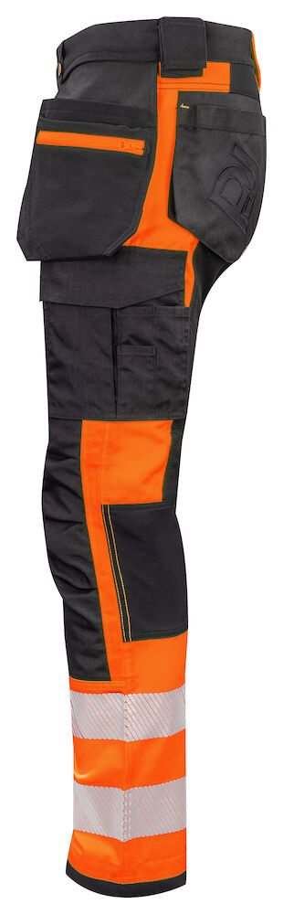 Elastyczne spodnie do pasa zapewniają maksymalną swobodę ruchów. Nowoczesny krój. Rozciągliwy w 4 kierunkach materiał na udach i siedzeniu dla maksymalnego komfortu i swobody poruszania. Boki u góry nie są rozciągliwe, aby zapewnić stabilność spodni na pasie. Kieszenie kaburowe z dodatkowymi przegrodami i wewnętrznym wzmocnieniem Cordura®, poprzez odczepienie kontrastowego szwu na tylnych kieszeniach kaburowych można je usunąć w razie potrzeby. Obszerne kieszenie na nogawkach po obu stronach. Kieszeń na lewej nogawce na narzędzia i długopisy, a także jedna kieszeń na telefon z zamkiem magnetycznym i uchwytem do mocowania identyfikatora. Z prawej strony kieszeń na miarkę i kieszeń na narzędzia. Szlufki z rzepem aby umożliwić przypięcue dodatkowego wyposażenia. Wyprofilowane kolana. Wewnętrzne kieszenie na ochraniacze kolan, regulowane na dwóch poziomach wysokości, otwierane od wewnątrz. Kieszenie kaburowe, tylne kieszenie, nogawki i kolana (aż do ud) są wzmocnione materiałem Cordura® dla zwiększenia trwałości. Elementy odblaskowe firmy 3M.
