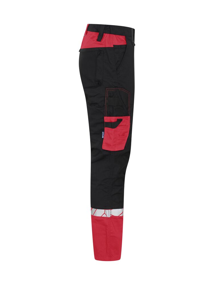 Spodnie robocze z otwartymi kieszeniami bocznymi oraz tylnymi o zwiększonej szerokości lewa strona wyposażona w klapę z magnetycznym zapięciem profilowane kolana oraz elastyczna tkanina w kroku i wszyty pas elastyczny w talii zapewniają dodatkowy komfort kieszenie na nogawkach po lewej stronie kieszeń z klapą i magnetycznym zamknięciem wewnętrzna kieszonka na telefon oraz uchwyt na identyfikator po prawej stronie kieszeń na miarkę składana oraz kieszeń na narzędzia z guzikiem na nóż kieszenie na ochraniacze kolan z zewnętrznym zamkiem błyskawicznym szeroka szlufka z tyłu zapobiega uciskowi pasa ukryty guzik z przodu wzmocnienia w kieszeni na miarkę tylnych kieszeniach oraz na kolanach zwiększają trwałość.