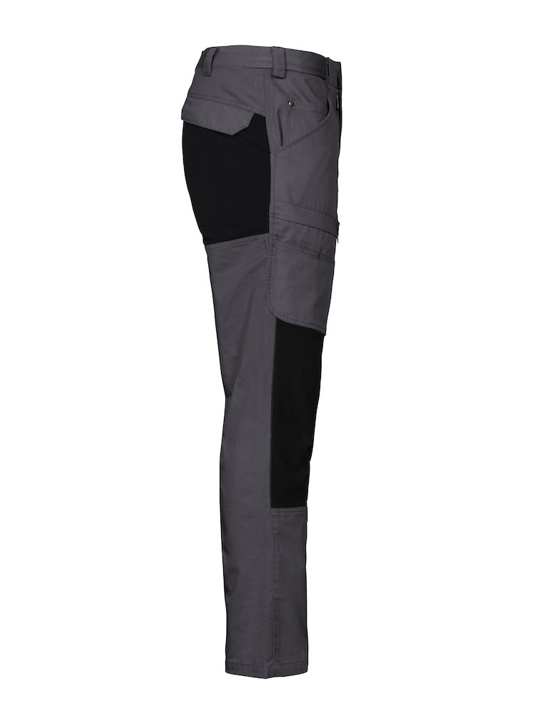 Spodnie robocze, z bardziej elastycznym materiałem (za sprawą strechu) na kolanach i siedzisku. Dwie kieszenie na nogawkach zapinane na zamek. Dwie kieszenie z tyłu z klapami. Zaczepy do przymocowania kieszeni.