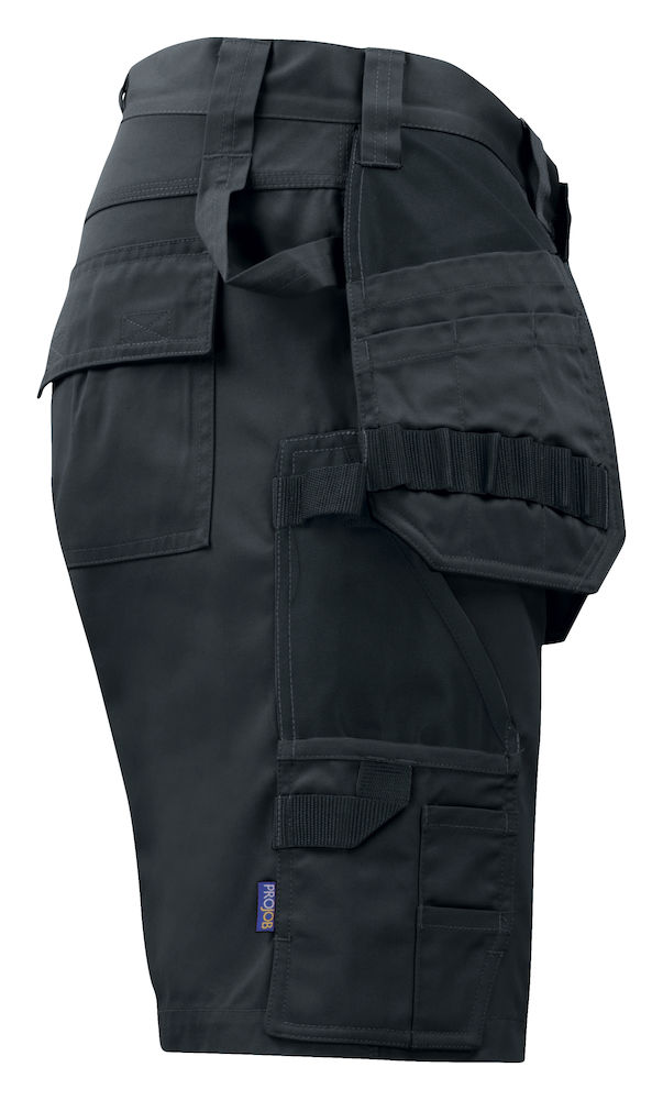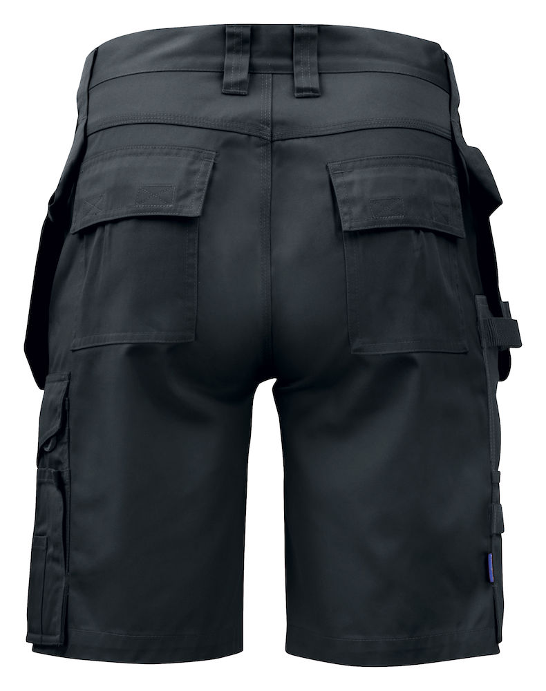 Krótkie spodnie robocze z poliestru i bawełny, które nie tracą kształtu i koloru przez długi czas. Spodenki z kieszeniami kaburowymi, które można wsunąć do bocznych kieszeni, jedna z dodatkową kieszenią zapinaną na zamek i jedna z pętlami na narzędzia. Tylne kieszenie z patką i zapięciem na rzep. Kieszeń na miarkę składaną i kieszeń na przechowywanie noża. Dwie pętle na młotek, po jednej z każdej strony. Wzmocnienie wewnątrz kieszeni na miarkę składaną i we wewnętrzu kieszeni kaburowych.