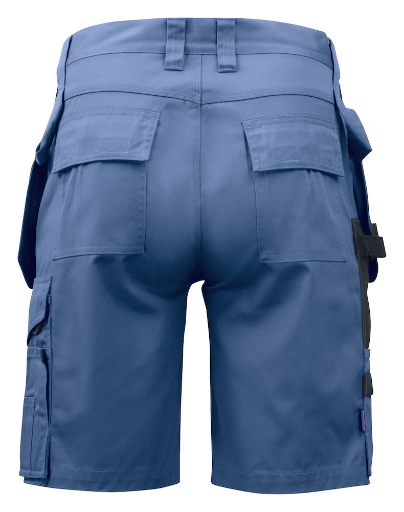 Krótkie spodnie robocze z poliestru i bawełny, które nie tracą kształtu i koloru przez długi czas. Spodenki z kieszeniami kaburowymi, które można wsunąć do bocznych kieszeni, jedna z dodatkową kieszenią zapinaną na zamek i jedna z pętlami na narzędzia. Tylne kieszenie z patką i zapięciem na rzep. Kieszeń na miarkę składaną i kieszeń na przechowywanie noża. Dwie pętle na młotek, po jednej z każdej strony. Wzmocnienie wewnątrz kieszeni na miarkę składaną i we wewnętrzu kieszeni kaburowych.