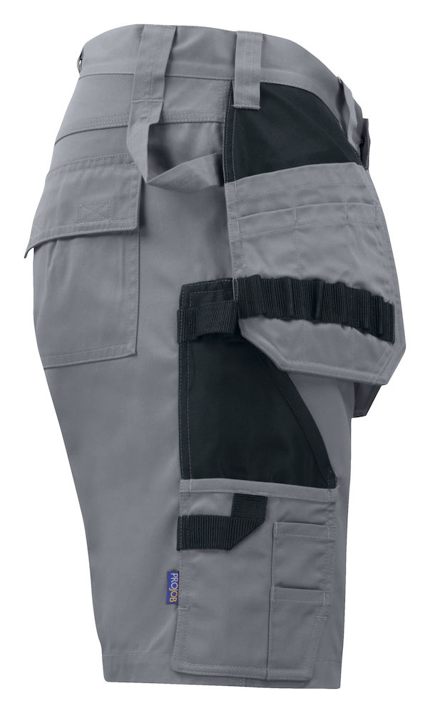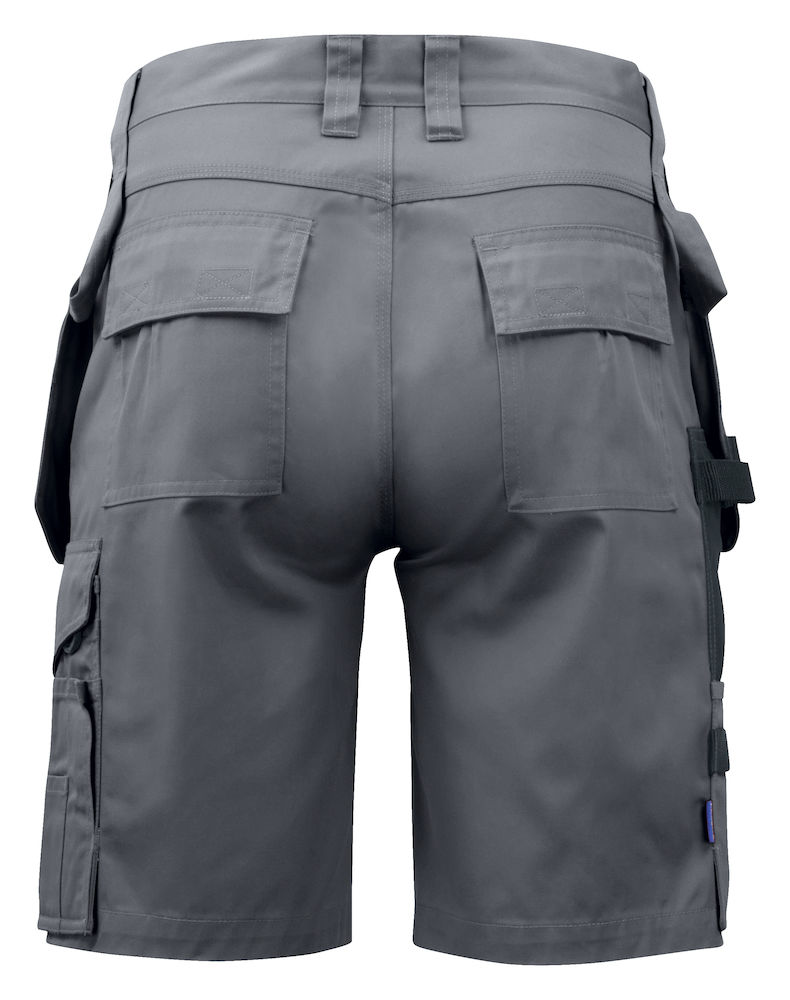 Krótkie spodnie robocze z poliestru i bawełny, które nie tracą kształtu i koloru przez długi czas. Spodenki z kieszeniami kaburowymi, które można wsunąć do bocznych kieszeni, jedna z dodatkową kieszenią zapinaną na zamek i jedna z pętlami na narzędzia. Tylne kieszenie z patką i zapięciem na rzep. Kieszeń na miarkę składaną i kieszeń na przechowywanie noża. Dwie pętle na młotek, po jednej z każdej strony. Wzmocnienie wewnątrz kieszeni na miarkę składaną i we wewnętrzu kieszeni kaburowych.