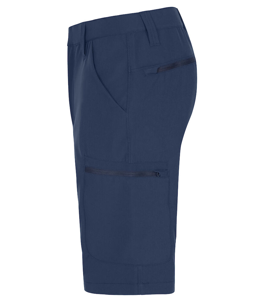 Krótkie spodnie z pełnym rozciąganiem o nowoczesnym, wąskim kroju. Szorty mają wszyty, regulowany pasek elastyczny w talii dla wygody, a także silikonowe paski, które utrzymują je na miejscu. Otwarte kieszenie boczne po obu stronach. Kieszenie na nogawkach po obu stronach zapinane na zamek, a także kieszenie tylne zapinane na zamek. Szersza szlufka z tyłu, aby uniknąć nacisku od paska na dolną część pleców. Ukryty guzik w talii.