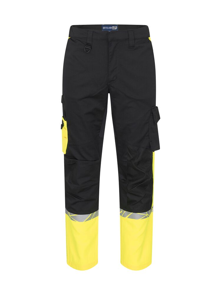 Spodnie serwisowe z otwartymi kieszeniami bocznymi i tylnymi. Kieszenie na nogawkach, po lewej stronie jedna przestronna kieszeń z klapą i zapięciem na magnes, jedna wewnętrzna kieszeń na telefon oraz uchwyt do mocowania identyfikatora. Po prawej stronie kieszeń na miarę składana oraz kieszeń na narzędzia z zapięciem na guzik. Wstępnie wyprofilowane kolana, materiał elastyczny w kroku oraz wszyta elastyczna taśma w pasie dla większego komfortu. Szeroka pętla na pasek z tyłu, aby zapobiec uciskowi od paska. Ukryty guzik z przodu. Kieszonka na chip do prania w wewnętrznym lewym szwie bocznym.