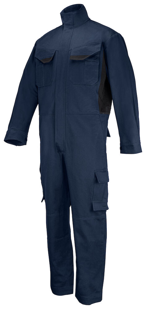 Kombinezon z dwustronnym zamkiem błyskawicznym z przodu, zabezpieczonym klapą. Kieszenie na piersi z zapięciem na rzep po obu stronach. Głębokie kieszenie boczne po obu stronach z otworami umożliwiającymi dostęp do kieszeni w spodniach pod kombinezonem. Kieszenie na długopisy, papiery i inne drobiazgi znajdują się na piersi po obu stronach, przy czym lewa kieszeń jest dodatkowo wyposażona w uchwyt do zamocowania identyfikatora i zamykana na rzep. Na lewej stronie nogawki znajduje się obszerna kieszeń z klapą i zapięciem na rzep, a także wewnętrzna kieszeń na telefon. Po prawej stronie znajdują się kieszenie na długopisy, papier i składaną miarkę. Tylna kieszeń również posiada klapę i zapięcie na rzep. Kombinezon wyposażony jest w regulowaną talię za pomocą wewnętrznego sznurka oraz regulowane mankiety na rzep. Dodatkowo, wewnątrz znajdują się kieszenie na ochraniacze na kolana. Długość nogawki można wydłużyć o 5 cm, zapewniając doskonałe dopasowanie i wygodę noszenia.
