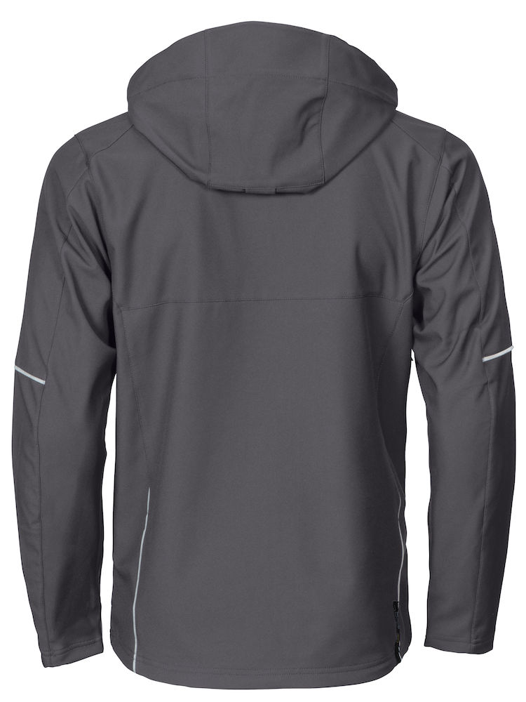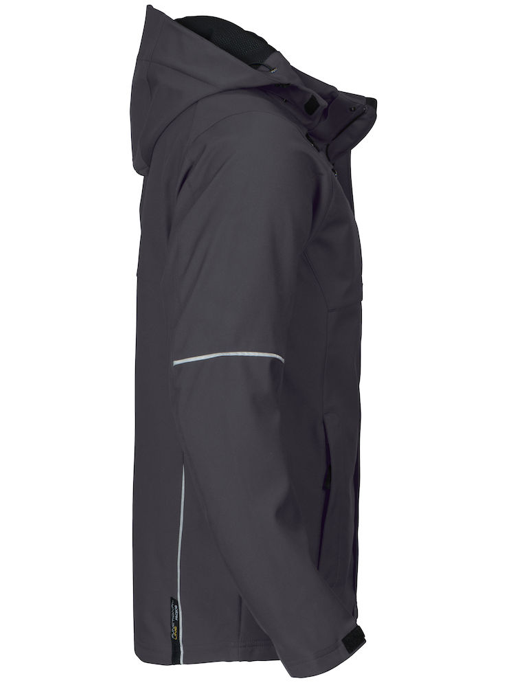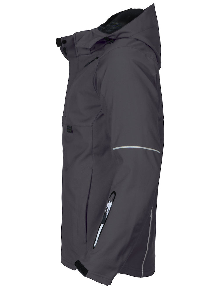 Funkcjonalna kurtka softshell, warstwa 3, wodoodporna. Dwie kieszenie na piersi, lewa z przestrzenią na telefon. Miejsce na identyfikator. Dwie kieszenie boczne. Kieszeń na ramieniu. Wewnętrzna kieszeń po lewej stronie z łatwym dostępem. Zamki wentylacyjne pod pachami. Sznurek w pasie. Łatwe w dopasowaniu mankiety. Przedłużony panel tylni dla większego komfortu. Odblaskowe wstawki na rękawach i z tyły. Odczepiany kaptur. Kołnierz wyłożony polarem.