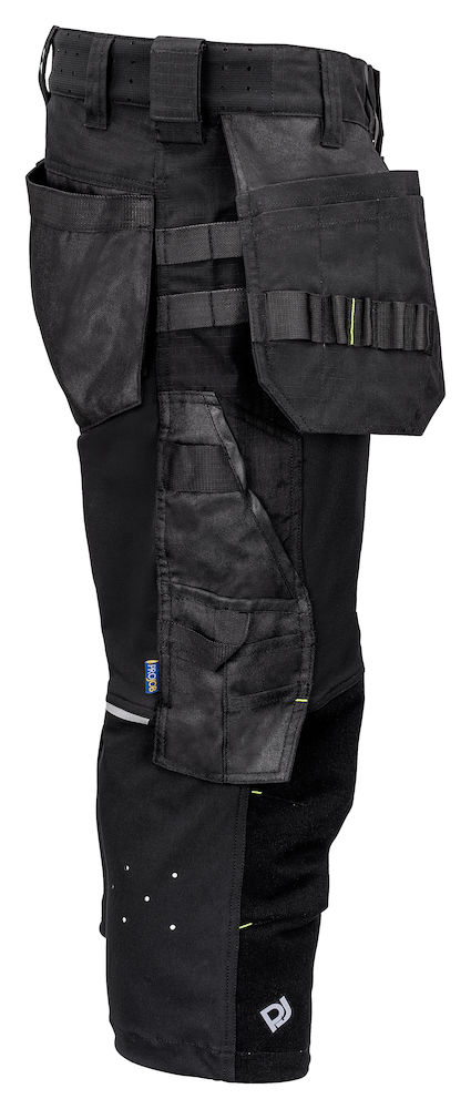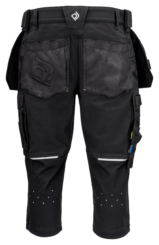 Ergonomiczne spodenki o bardzo dużej elastyczności dla maksymalnej swobody ruchu i komfortu. Nowoczesny krój. Rozciągliwość w 4 kierunkach na udach i pośladkach, rozciągliwość w 2 kierunkach z tyłu kolan. Boki u góry nie są rozciągliwe, aby zapewnić stabilność spodni na pasie. Otwory wentylacyjne z zamkami błyskawicznymi po obu stronach nogawek z podszewką z siateczki, również wentylacja w pasie i tylnej stronie kolan. Kieszenie na nogawkach, po lewej stronie kieszeń na narzędzia i długopisy, jedna kieszeń na telefon z zapięciem magnetycznym i jeden uchwyt do mocowania identyfikatora. Z prawej strony kieszeń na miarkę i kieszeń na narzędzia. Możliwość obustronnego wpięcia systemu MOLLE, a także możliwość dopięcia rzepu na młotek. Odblaskowe detale dla lepszej widoczności. Wyprofilowane kolana. Wewnętrzne kieszenie na ochraniacze kolan, regulowane w dwóch poziomach wysokości. Kolana są wzmocnione rozciągliwym Kevlarem dla zwiększenia trwałości i komfortu.