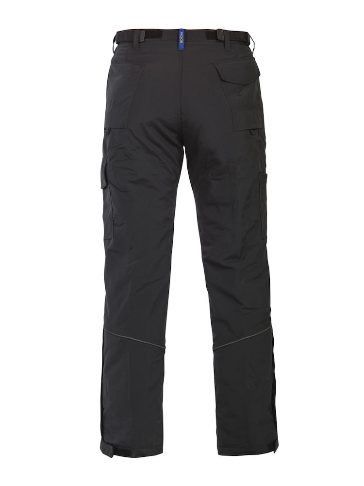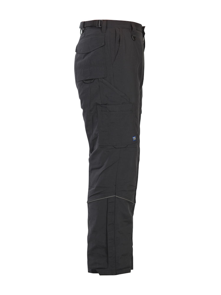 Spodnie z wyściółką i kieszeniami bocznymi po obu stronach, prawa z wewnętrzną kieszenią bezpieczeństwa zapinaną na suwak. Kieszenie na nogawkach, po lewej stronie jedna pojemna kieszeń z klapką i zapięciem na rzep oraz jedna kieszeń na telefon. Po prawej stronie kieszenie na długopisy, papier i miarkę składaną. Tylne kieszenie, po prawej stronie z klapką. D-ring z przodu. Spodnie są regulowane w pasie za pomocą rzepu. Wewnętrzne kieszenie na ochraniacze kolan. Odblaskowe lamówki wokół nogawek.