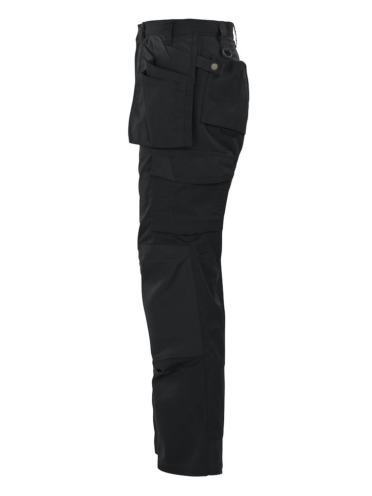 Dwie zwisające kieszenie na gwoździe, które można wpuścić do środka, jedna z dodatkowymi kieszeniami, jedna z uchwytami na narzędzia. Kieszenie na gwoździe wzmocnione 100% włóknem Cordura®. Głębokie kieszenie boczne z miejscem na kieszenie wiszące. Dodatkowo wzmacniane podwójną tkaniną na wysokości uda. Kieszeń na nogawce zintegrowana z kieszenią na telefon, kieszenią na długopis i kieszenią na narzędzia. Dwa regulowane uchwyty na młotek. Dwa uchwyty typu D-ring. Kieszeń na przymiar metrowy z kieszenią na narzędzia, kieszenią na długopis i uchwytem nożowym. Kieszenie na kolanach wzmacniane włóknem Cordura®, otwierane od wewnątrz, regulowana wysokość ochraniaczy kolan. Wygięte kolana. Dół tylnej strony nogawek wzmocniony włóknem Cordura®. Ekstra szerokie kieszenie tylne. Kieszenie tylne i na nogawkach posiadają pętle na system Inbags.