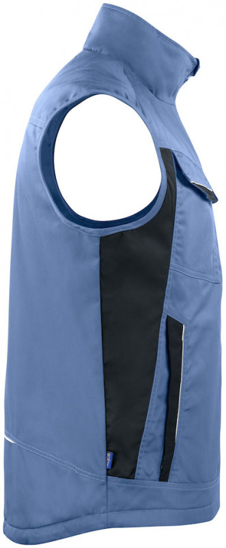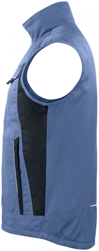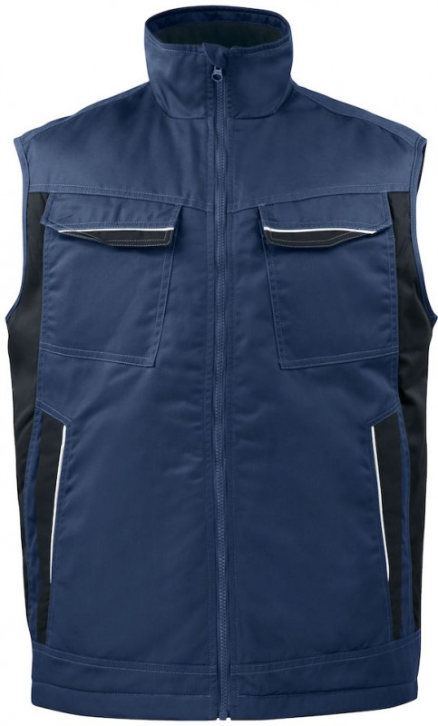 Wyściełana kamizelka z poliestru i bawełny z zamkiem błyskawicznym na całej długości z przodu, z wewnętrzną osłoną przeciwwiatrową i osłoną podbródka, aby zapobiec przeciągom i obtarciom. Kamizelka spełnia wymagania odzieży roboczej dla większości zawodów. Wysokie zagęszczenie barwników utrzymuję kolor na dłużej. Dwie kieszenie na piersi, kieszeń typu D-ring na identyfikator. Przednie kieszenie wzmocnione materiałem poliamidowym, zapinane na zamek. Przedłużony tył kamizelki. Wewnętrzna kieszeń z lewej strony na telefon komórkowy zapinana na rzep. Ogromna, wewnętrzna kieszeń z prawej strony na zamek velcro. Odblaski z przodu i z tyłu.