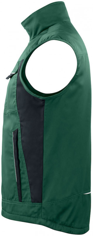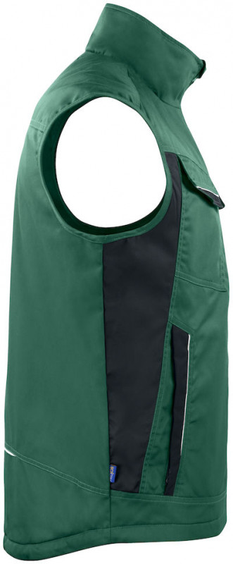 Wyściełana kamizelka z poliestru i bawełny z zamkiem błyskawicznym na całej długości z przodu, z wewnętrzną osłoną przeciwwiatrową i osłoną podbródka, aby zapobiec przeciągom i obtarciom. Kamizelka spełnia wymagania odzieży roboczej dla większości zawodów. Wysokie zagęszczenie barwników utrzymuję kolor na dłużej. Dwie kieszenie na piersi, kieszeń typu D-ring na identyfikator. Przednie kieszenie wzmocnione materiałem poliamidowym, zapinane na zamek. Przedłużony tył kamizelki. Wewnętrzna kieszeń z lewej strony na telefon komórkowy zapinana na rzep. Ogromna, wewnętrzna kieszeń z prawej strony na zamek velcro. Odblaski z przodu i z tyłu.