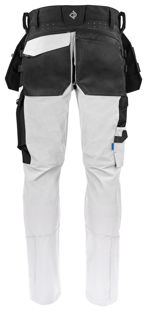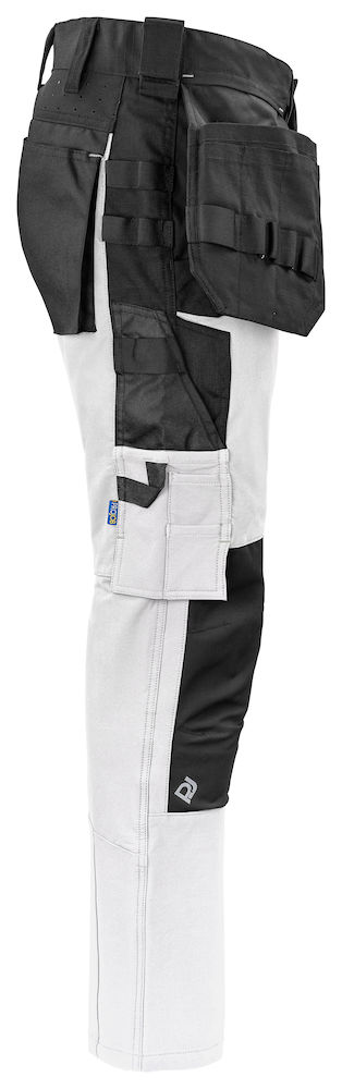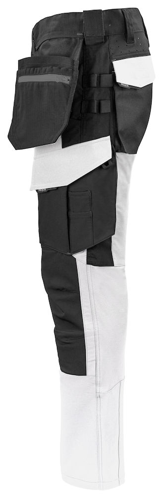 Spodnie do pasa bardzo elastyczne, które zapewniają maksymalną swobodę ruchu i komfort. Nowoczesny krój. Boki u góry nie są rozciągliwe, aby zapewnić stabilność spodni na pasie. Kieszenie kaburowe z dodatkowymi przegrodami i wewnętrznym wzmocnieniem Cordura®, poprzez odczepienie kontrastowego szwu na tylnych kieszeniach kaburowych można je usunąć w razie potrzeby. Otwory wentylacyjne z tyłu w pasie. Obszerne kieszenie na nogawkach po obu stronach. Kieszeń na lewej nogawce na narzędzia i długopisy, jedna kieszeń na telefon z zapięciem magnetycznym i jeden uchwyt do mocowania identyfikatora. Z prawej strony kieszeń na miarkę i kieszeń na narzędzia. Szersza szlufka z tyłu zapobiega uciskowi paska. Tylne kieszenie z Cordury®, jedna z klapką i zapięciem magnetycznym. Wyprofilowane kolana. Wewnętrzne kieszenie na ochraniacze kolan, regulowane na dwóch poziomach wysokości. Kieszenie kaburowe oraz kieszenie na kolana wzmocnione są materiałem Cordura® dla zwiększenia trwałości. Możliwość obustronnego mocowania systemu MOLLE.