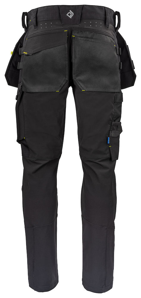 Spodnie do pasa bardzo elastyczne, które zapewniają maksymalną swobodę ruchu i komfort. Nowoczesny krój. Boki u góry nie są rozciągliwe, aby zapewnić stabilność spodni na pasie. Kieszenie kaburowe z dodatkowymi przegrodami i wewnętrznym wzmocnieniem Cordura®, poprzez odczepienie kontrastowego szwu na tylnych kieszeniach kaburowych można je usunąć w razie potrzeby. Otwory wentylacyjne z tyłu w pasie. Obszerne kieszenie na nogawkach po obu stronach. Kieszeń na lewej nogawce na narzędzia i długopisy, jedna kieszeń na telefon z zapięciem magnetycznym i jeden uchwyt do mocowania identyfikatora. Z prawej strony kieszeń na miarkę i kieszeń na narzędzia. Szersza szlufka z tyłu zapobiega uciskowi paska. Tylne kieszenie z Cordury®, jedna z klapką i zapięciem magnetycznym. Wyprofilowane kolana. Wewnętrzne kieszenie na ochraniacze kolan, regulowane na dwóch poziomach wysokości. Kieszenie kaburowe oraz kieszenie na kolana wzmocnione są materiałem Cordura® dla zwiększenia trwałości. Możliwość obustronnego mocowania systemu MOLLE.