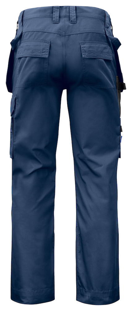 Spodnie rzemieślnicze z chowanymi kieszeniami kaburowymi, z których jedna jest zapinana na zamek. Tylne kieszenie z klapką i zapięciem na rzep. Kieszeń na nogawce z dodatkową przegródką i klapką zamykaną na rzep. Kieszeń na miarkę z uchwytem na nóż. Wzmocnienia w kieszeniach kaburowych, kieszeni na miarkę oraz kieszeniach na ochraniacze kolan. Odblaskowe detale po zewnętrznej stronie nogawek. Profilowane kolana z kieszeniami na ochraniacze, regulowanymi na dwóch wysokościach, z dostępem od wewnątrz. Rozmiary C42-C64 można przedłużyć o 5 cm dzięki specjalnej zakładce na dole nogawki.