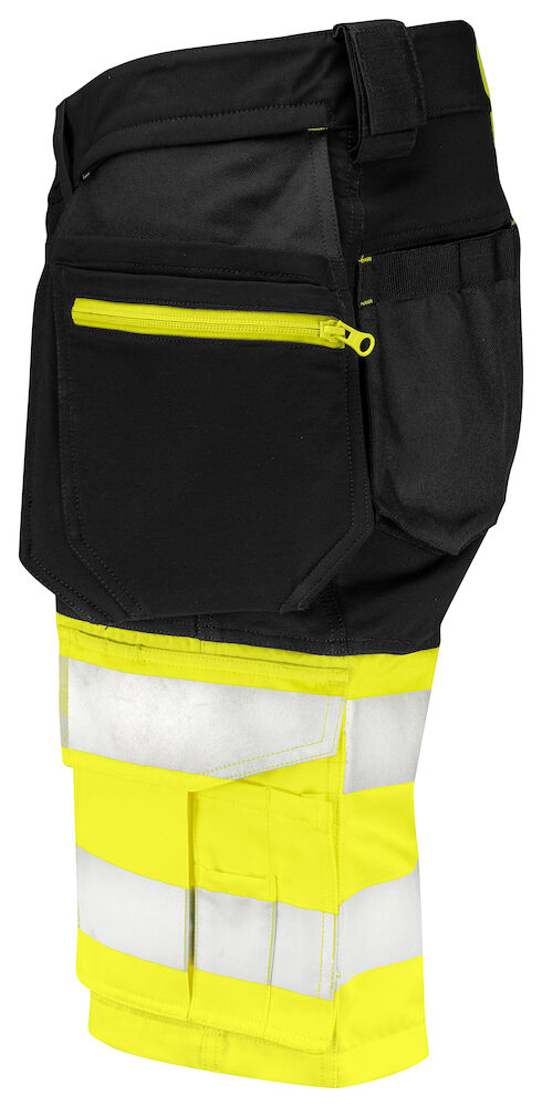 Krótkie spodenki z elastycznego materiału dla maksymalnej swobody ruchu. Nowoczesny krój. Czterokierunkowy stretch na udach i plecach. Boki u góry nie są elastyczne, aby zapewnić stabilność szortom. Kieszenie kaburowe z dodatkowymi przegródkami i wewnętrznym wzmocnieniem z Cordura®. Poprzez odprucie kontrastowego szwu na tylnej stronie kieszeni kaburowe mogą być usunięte, jeśli jest taka potrzeba. Pojemne kieszenie na nogawkach po obu stronach. Kieszeń na lewej nogawce na narzędzia i długopisy, a także kieszeń na telefon z magnetycznym zamknięciem i uchwytem do mocowania karty identyfikacyjnej. Po prawej stronie kieszeń na miarkę składana oraz kieszeń na narzędzia z guzikiem na nóż. Możliwość dodania dodatkowego wyposażenia za pomocą rzepu. Kieszenie kaburowe są wzmocnione materiałem Cordura® dla zwiększonej trwałości. Odblaski 3M.