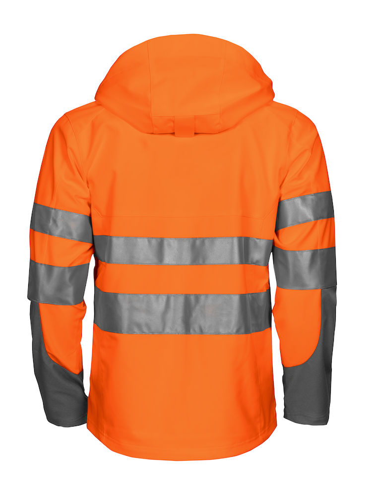 Odblaskowa kurtka wykonana z tkaniny typu Softshell, która jest odporna na działanie wiatru i wody. Dwie kieszenie na piersi, lewa z kieszenią wewnętrzną na telefon, prawa z miejscem na identyfikator. Dwie głębokie kieszenie zapinane na zamek zawierające jedną większą na dokumenty. Dwie boczne kieszenie i kieszeń na lewym rękawie. Po lewej stronie wewnętrzna kieszeń z otworem. Zamki wentylacyjne pod pachami i regulowane mankiety. W pasie sznurek do ściągania. Przedłużony tył i odpinany kaptur dla zwiększenia komfortu. Elementy odblaskowe umieszczone z tyłu i na rękawach. Kołnierz i kieszenie wyściełane polarem.
