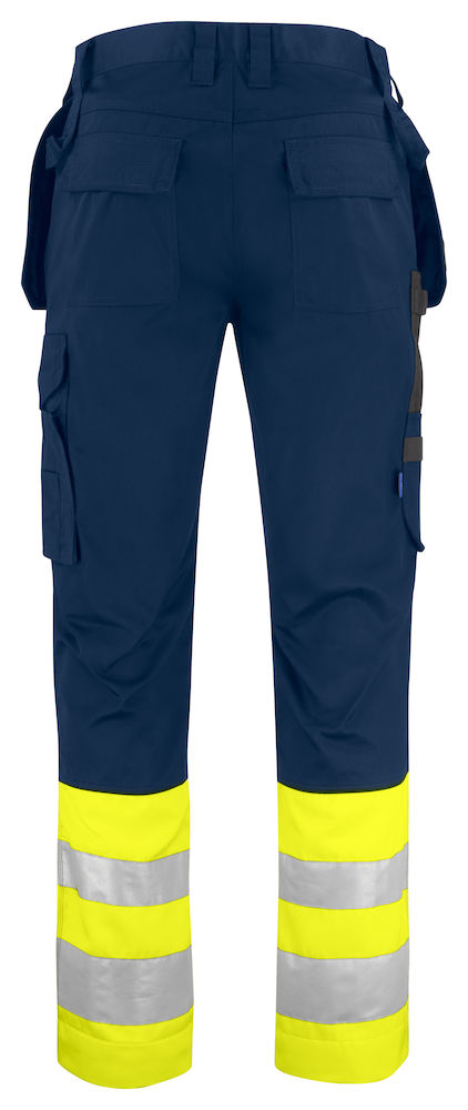 Spodnie do pasa hi viz klasy 1 wykonane z poliestru i bawełny, utrzymują swój kolor i kształt nawet po wielokrotnym praniu. Boczne kieszenie posiadają dodatkowe przedziały oraz kieszeń z zamkiem. Tylne kieszenie z patką i zamknięciem na rzep. Kieszeń na nogawce z miejscem na przechowywanie noża. Regulowane ochraniacze na kolana. Rozmiary od C42 do C64 mogą być wydłużone do 5 cm.