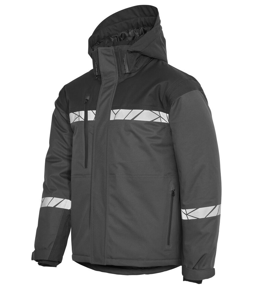 Ocieplana kurtka typu softshell z wiatro- i wodoodpornego materiału. Zamek błyskawiczny z przodu osłonięty patką, aby zapobiec przedostawaniu się wiatru i wody. Kieszeń na piersi po prawej stronie z wewnętrznym uchwytem do mocowania identyfikatora. Po obu stronach kieszenie boczne z zamkami, wyściełane polarem. Wewnętrzne kieszenie po obu stronach zapinane na rzep. Przedłużony tył. Odpinany kaptur z regulacją na troczki. Regulowane mankiety na rzep oraz dodatkowy wewnętrzny mankiet chroniący przed zimnem. Regulowany dół za pomocą troczka. Kieszonka na chip do prania w wewnętrznym lewym szwie bocznym.