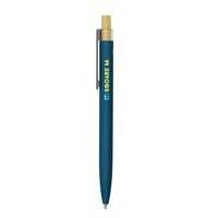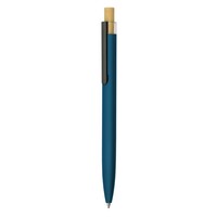 Długopis z kolorowym trzonem i elementami w szarym kolorze, posiada bambusowy przycisk, wkład w granatowym kolorze, produkt wykonany z aluminium z recyklingu, bambusa i RP