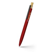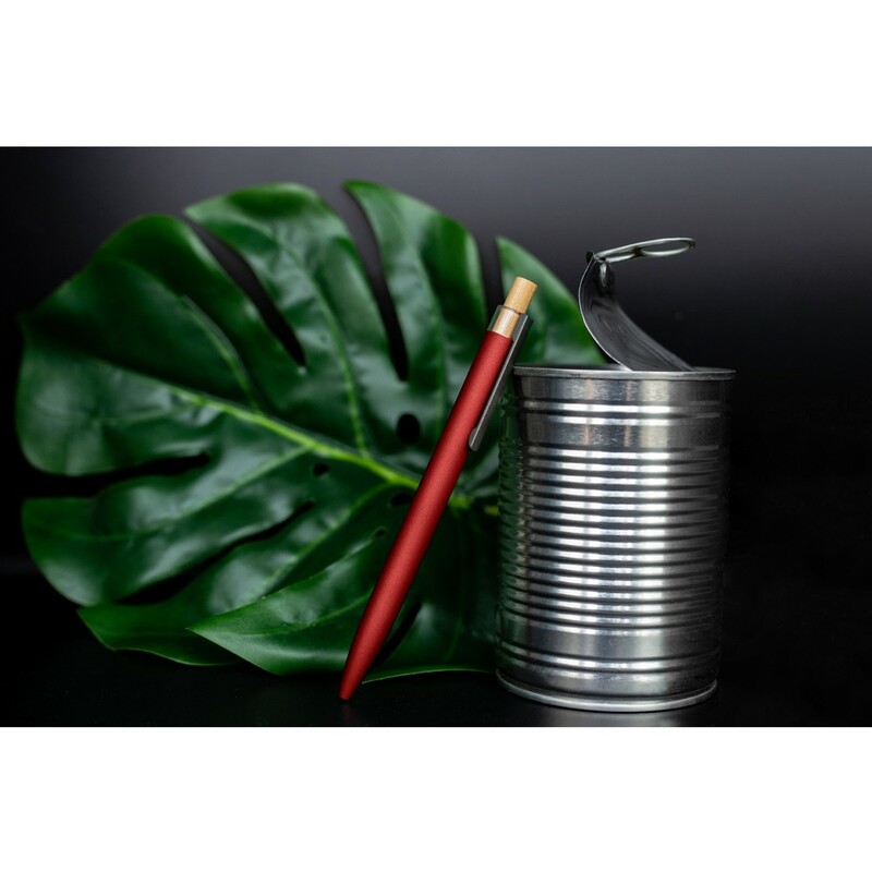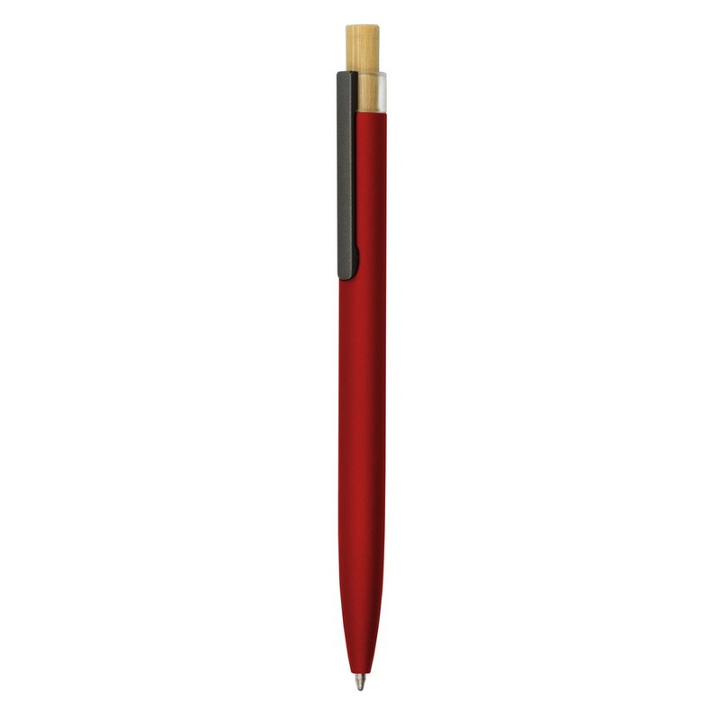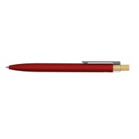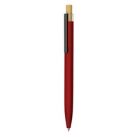 Długopis z kolorowym trzonem i elementami w szarym kolorze, posiada bambusowy przycisk, wkład w granatowym kolorze, produkt wykonany z aluminium z recyklingu, bambusa i RPET