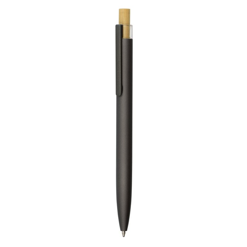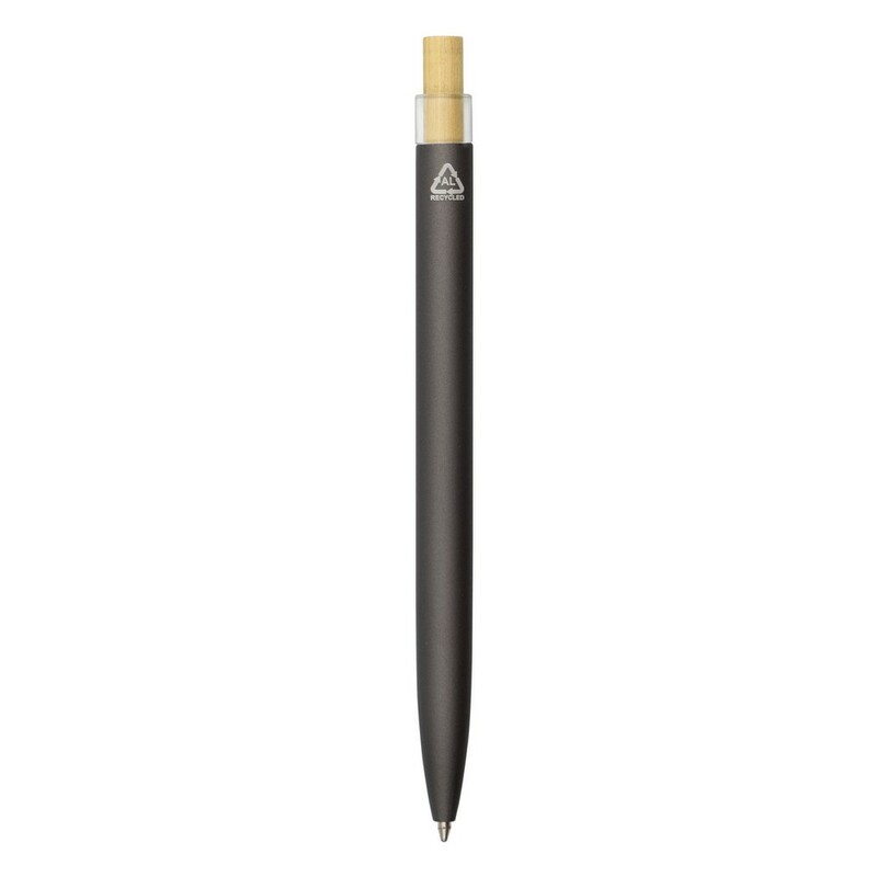 Długopis z kolorowym trzonem i elementami w szarym kolorze, posiada bambusowy przycisk, wkład w granatowym kolorze, produkt wykonany z aluminium z recyklingu, bambusa i RPET