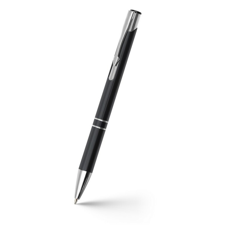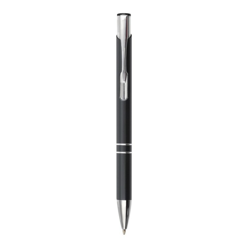 Długopis z kolorowym trzonem o błyszczącym wykończeniu, posiada elementy w srebrnym kolorze, wkład w niebieskim kolorze, produkt wykonany z aluminium