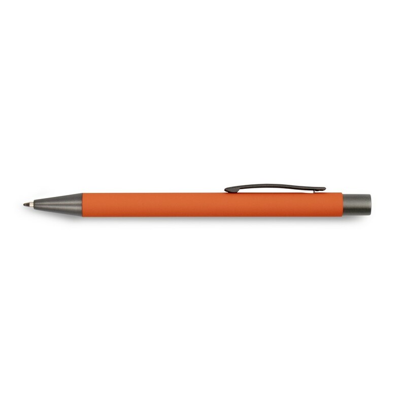 Długopis z kolorowym trzonem i szarymi elementami, posiada gumowe wykończenie, wkład w niebieskim kolorze, produkt wykonany z aluminium, plastiku i metalu