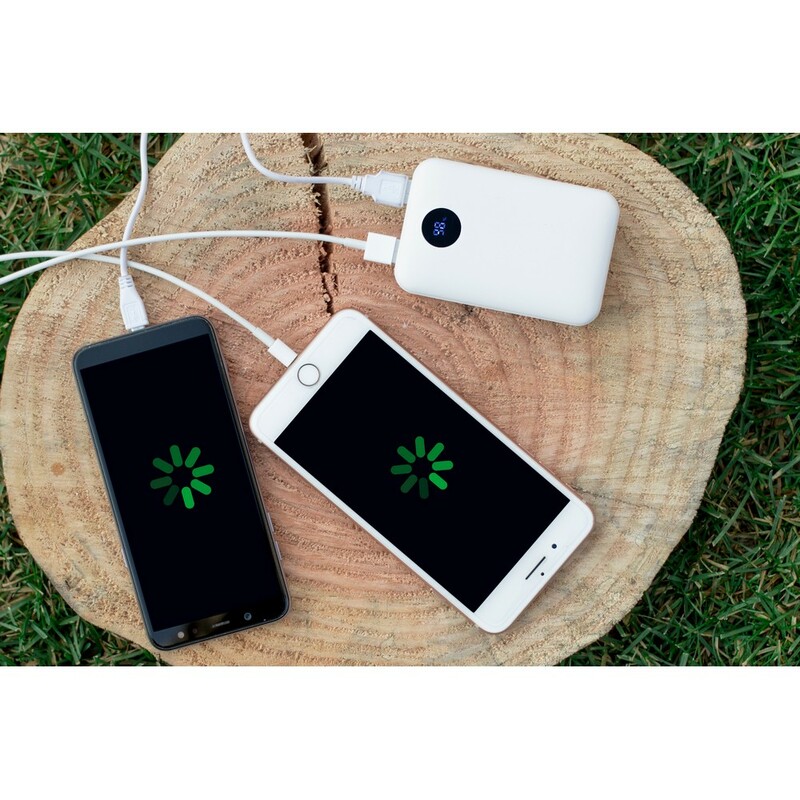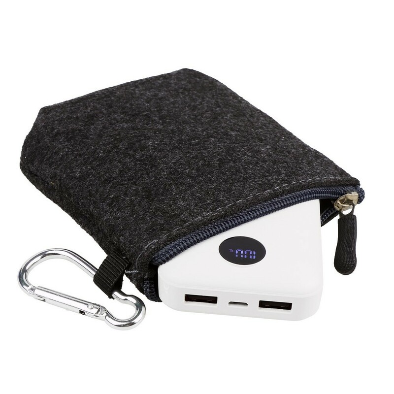 Power bank Air Gifts 10000 mAh, może zmieścić się w kieszeni czy większości przegródek w plecaku, posiada cyfrowy wyświetlacz poziomu naładowania, wejścia 5V/2A: USB-C oraz micro USB, 2 wyjścia USB (max. 5V/2A), możliwość ładowania dwóch urządzeń jednocześnie, w komplecie kabel USB-C oraz filcowe etui z karabińczykiem umożliwiającym przypinanie, produkt wykonany z ABS i filcu