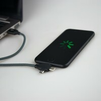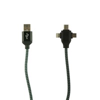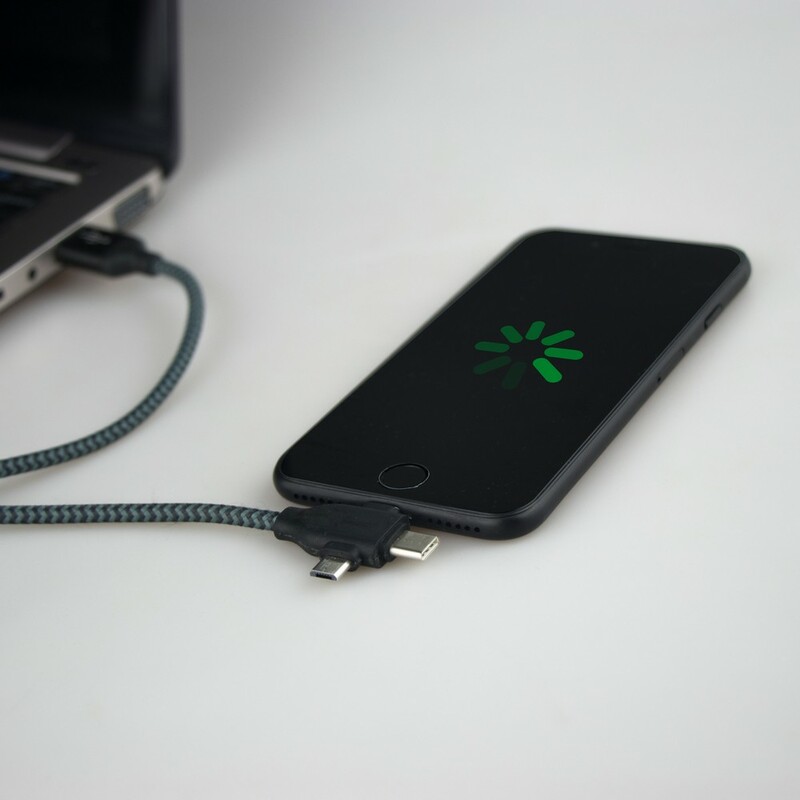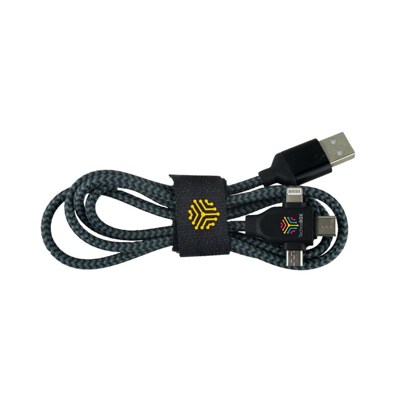 Kabel do ładowania i synchronizacji z 4 końcówkami: USB, USB-C, micro USB oraz końcówką kompatybilną z urządzeniami iOS, długość 100 cm, połączony paskiem na rzep z miejscem na znakowanie
