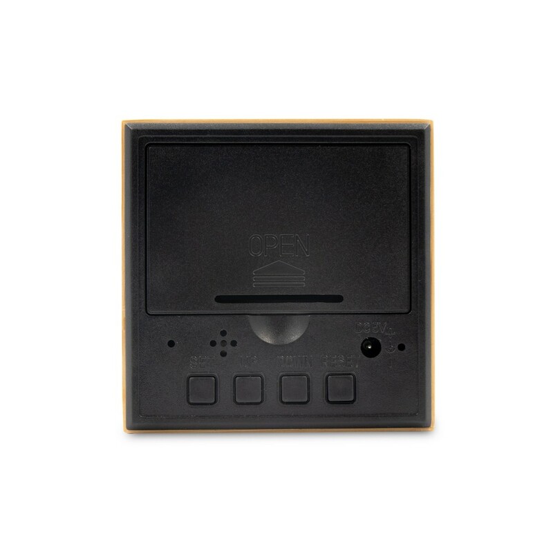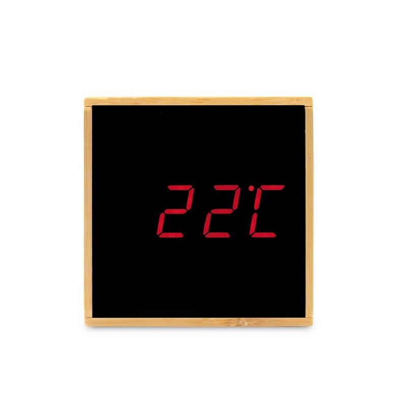 Bambusowy zegar na biurko, wyświetlacz LCD, zasilany przez kabel (w komplecie) 5V 500 mA, alternatywne źródło zasilania: 3 baterie AAA (nie są dołączone), możliwość zamontowania baterii CR2032 (nie jest dołączona) podtrzymującej ustawienia po odłączeniu od zasilania, funkcje: czas, data, temperatura, alarm (możliwość ustawienia 3 alarmów na 3 różne godziny)