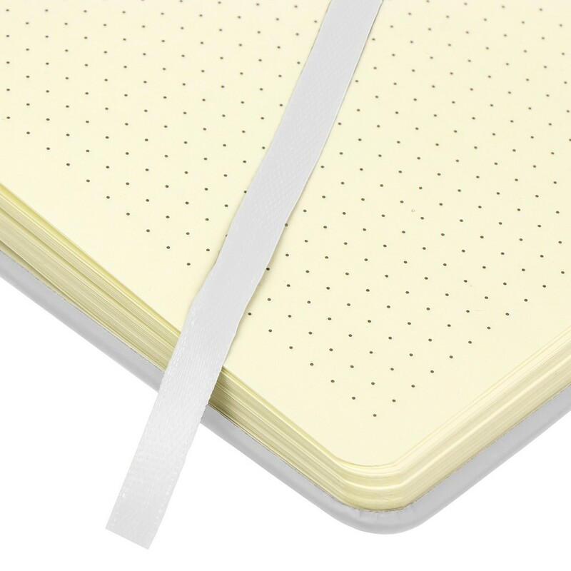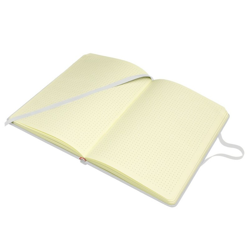Notatnik w formacie A5, posiada 96 kartek w kropki (192 strony), tasiemka zakładkowa umożliwia wygodne zaznaczanie ostatniej strony lub ważniejszych notatek, dodatkowe zamknięcie w postaci dopasowanej kolorystycznie elastycznej opaski, twarda okładka wykonana z PU