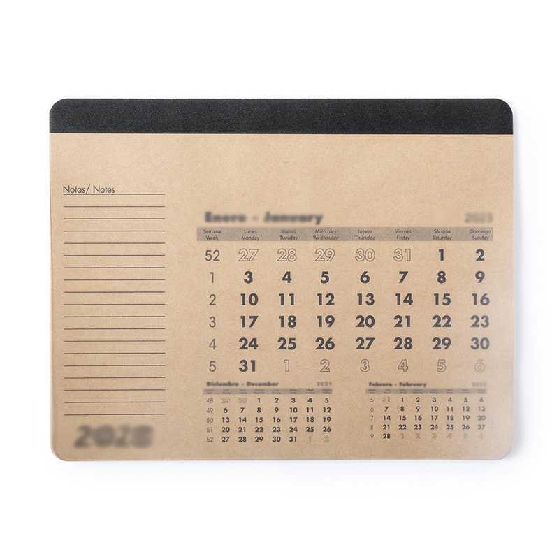 Podkładka pod mysz z kalendarzem wykonanym z papieru z recyklingu, kalendarz: aktualny miesiąc, poprzedni i następny miesiąc, miejsce na notatki, transparentna osłona oraz antypoślizgowy spód