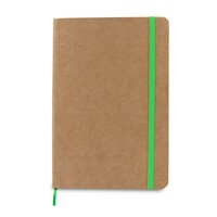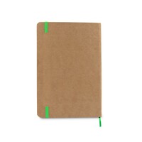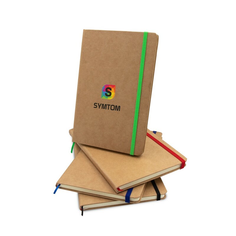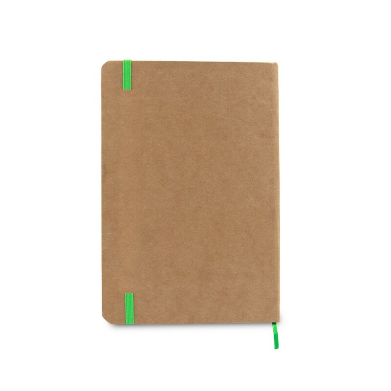 Notatnik w formacie ok. A5, posiada 96 kremowych kartek w linie (192 strony), tasiemka zakładkowa umożliwia wygodne zaznaczanie ostatniej strony lub ważniejszych notatek, dodatkowe zamknięcie w postaci kolorowej elastycznej opaski, twarda okładka wykonana z kartonu z recyklingu