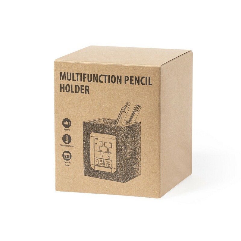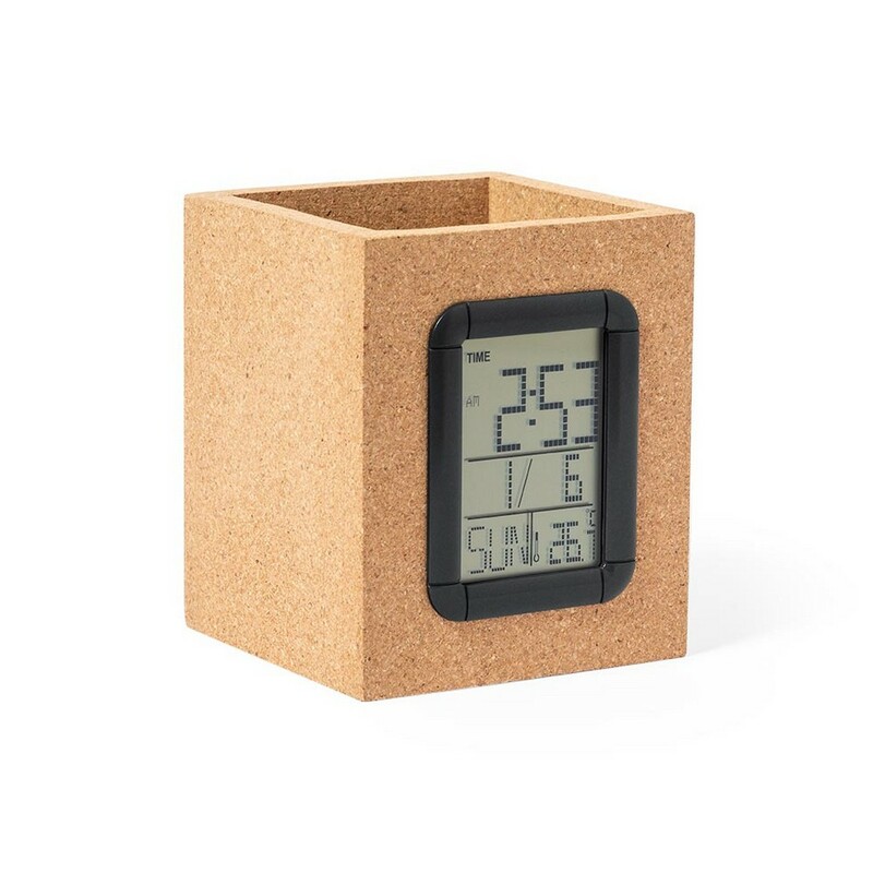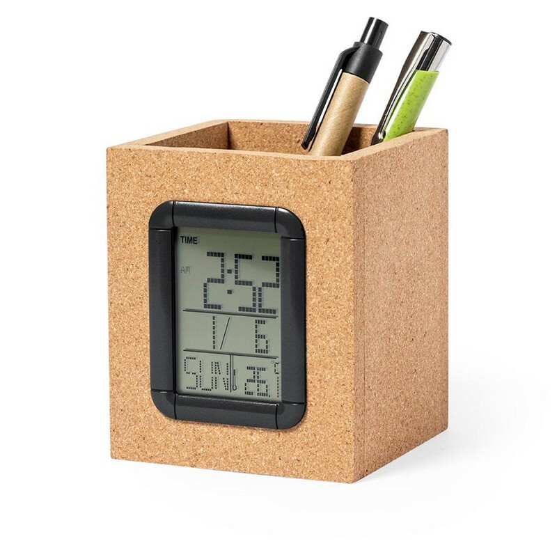 Korkowy pojemnik na przybory do pisania z kalendarzem, zegarem, alarmem i termometrem