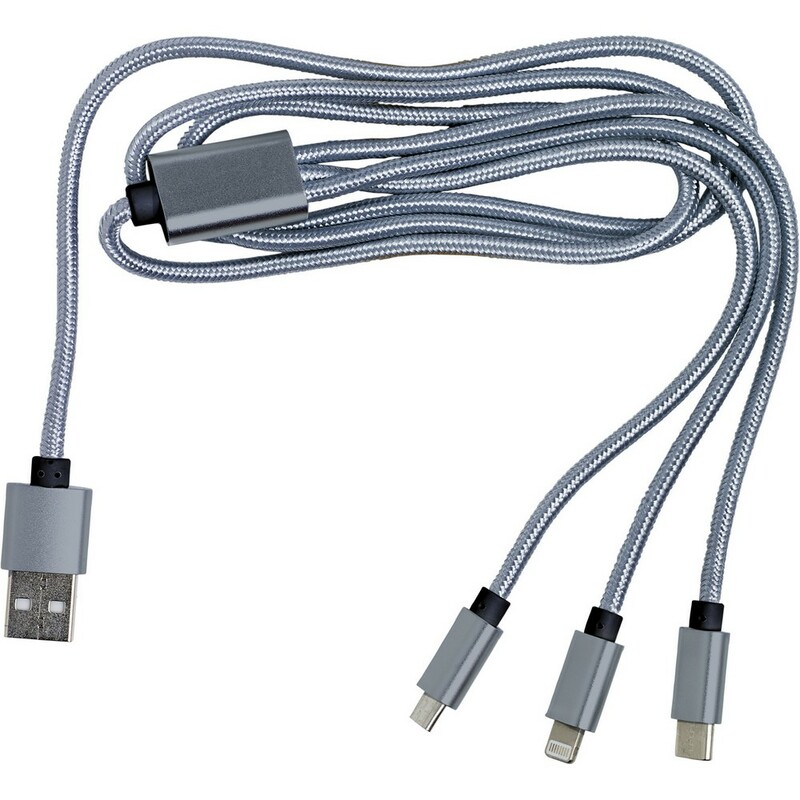 Kabel do ładowania z 4 końcówkami: USB, typu C, micro USB oraz kompatybilną z urządzeniami iOS, co umożliwia jednoczesne ładowanie kilku urządzeń o różnych złączach